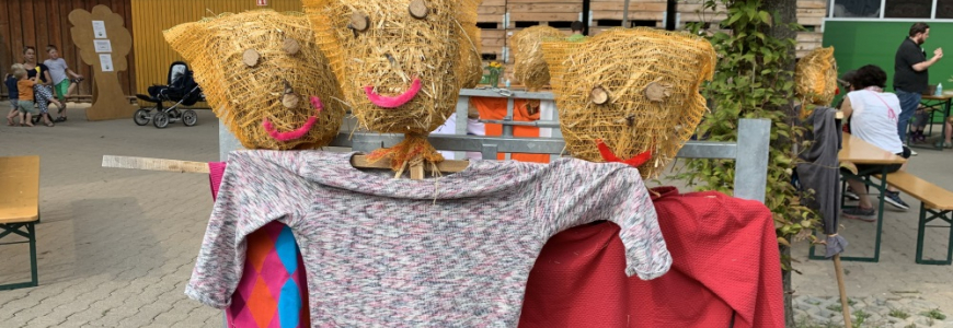 der Familiennachmittag auf unserem Hof war wunderschön. Viele Kinder mit ihren Eltern haben unseren sonst eher stillen Hof zum Leben erweckt. Kreativ und mit vielen Ideen wurden Obstkörbchen gebastelt, Mandalas ausgemalt oder gar Vogelscheuchen gebaut. Mit Holz, Akkuschrauber, Kartoffelsäckchen, Stroh und Baumscheiben entstanden die lustigsten Kreaturen. Das Ernten in unserem Obstgarten gefiel Klein und Groß, Jürgen Winkler hatte viele Fragen zu beantworten. Die selbst geernteten Früchte wurden kunstvoll geschnitten oder durch den mechanischen Apfelschäler gedreht – da entstanden tolle Girlanden die anschließend verspeist wurden. Reste konnten in von uns bereitgestellten Vesperboxen mit nach Hause genommen werden. Für den Hunger wurden Dinkel-Waffeln gebacken oder man stärkte sich an unserem Getränke- und Backwarenstand. Die Eltern genossen die ein oder andere Tasse Kaffee während mit Riesen-Jenga-Steinen Türme gebaut, mit den Pedalos gefahren, Fußball gespielt oder gesandelt wurde. Auch an unseren Spielstationen mit den Klassikern wie Dosenwerfen oder Sackhüpfen gab es einige spannende Familienduelle. Die Fahrten in unserem WINO-Zügle waren stets ausgebucht.