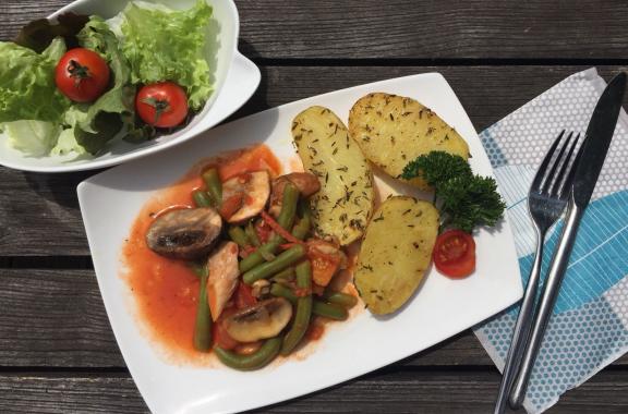 ca. 8 x 7 cm breite Streifen schneiden. Thymianblättchen von den Stielen streifen.
