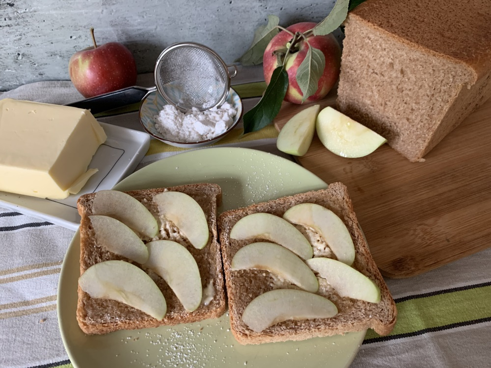 Stell die Butter aus dem Kühlschrank, damit du sie nachher besser verstreichen kannst. Schneide den Apfel auf dem Brettchen in 4 Teile. Danach das Kernhaus herausschneiden. Aus jedem Schnitz jetzt ganz dünne Scheiben herunterschneiden. Steck Scheiben vom Toast in den Toaster, der darf ein bisschen höher eingestellt sein, damit dein Brot richtig knusprig wird. Wenn die Toasts fertig sind diese gleich mit der Butter verstreichen. So dass die Butter schön verläuft. Du kannst reichlich Butter nehmen, damit diese richtig in das Sandwich einzieht. Jetzt ein ganz kleines bisschen Salz, am besten mit dem Salzstreuer, auf die Toasts geben. Danach die Apfelscheiben darauf. Zum Schluss Puderzucker über das Sandwich rieseln lassen. Das geht am einfachsten mit einer Puderzuckermühle oder einem kleinen Sieb. Wenn du möchtest kannst du immer 2 Scheiben zu einem Sandwich zusammenklappen. Übrige Apfelscheiben kannst du einfach dazu essen. Lass es dir schmecken!
