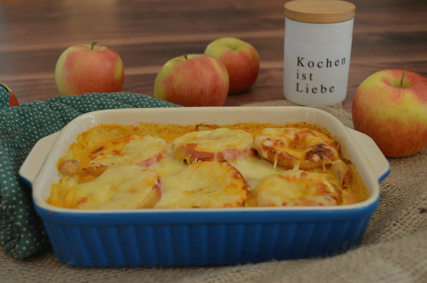 eine Lage Äpfel hineinlegen, dann die Hälfte des Fleisches,