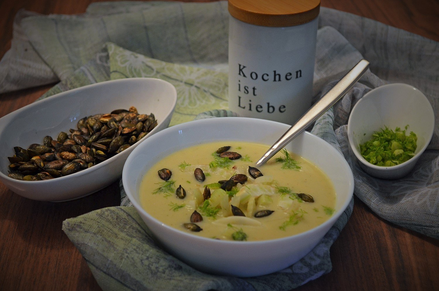 • oder den Fenchel zur Suppe in den Topf geben und die Kürbiskerne separat auf den Tisch stellen,