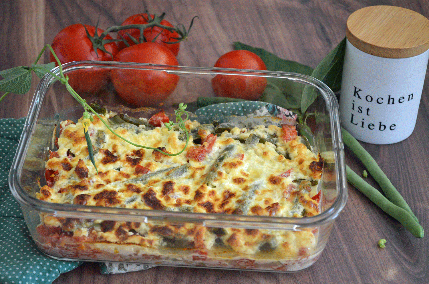 die abgetropften Bohnen, Zwiebeln, Knoblauch und Tomaten in eine Auflaufform geben und mischen,