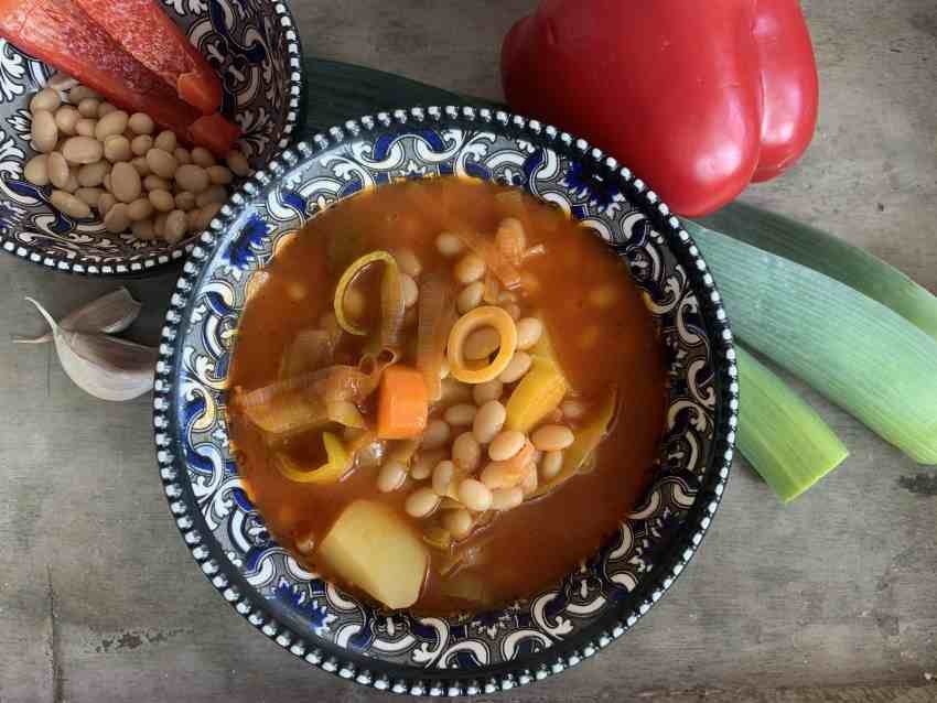 Bohnen nach Packungsanleitung zubereiten. Evtl. über Nacht einweichen. Kartoffeln schälen und in grobe Stücke schneiden. Möhren schälen und in Scheiben, Lauch in Ringe, Paprika in mundgerechte Stücke, Knoblauch fein schneiden. Das Gemüse in Olivenöl scharf anbraten. Das Ajvar und das Tomatenmark dazugeben und kurz mitbraten und dann mit Wasser ablöschen. So viel Wasser zugeben, dass noch genügend Platz für die Bohnen später ist. Köcheln lassen, bis die Kartoffeln weich sind. Mit Salz, Pfeffer und evtl. Chilipulver abschmecken. Zum Schluss die Bohnen dazugeben.