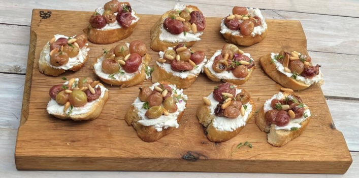 Den Manouri auf den Brotscheiben verstreichen. Die Balsamico-Trauben darauf verteilen und mit etwas Honig beträufeln. Die Bruschetta mit Thymian und Pinienkernen bestreuen.