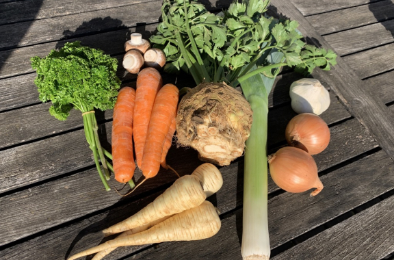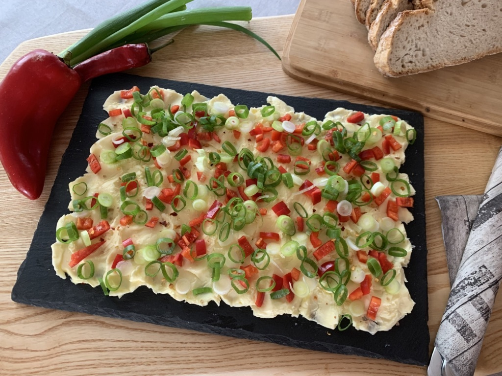 Butter (Sauerrahm) auf dem Brett verteilen. Am besten in Stücke schneiden und diese dann mit dem Butterpapier glatt drücken. 2-3 Stängel Bundzwiebeln und Paprika fein schneiden. Auf der Butter verteilen. Wer mag kann auch Chilistücke dazugeben. Mit Salz und Pfeffer würzen.