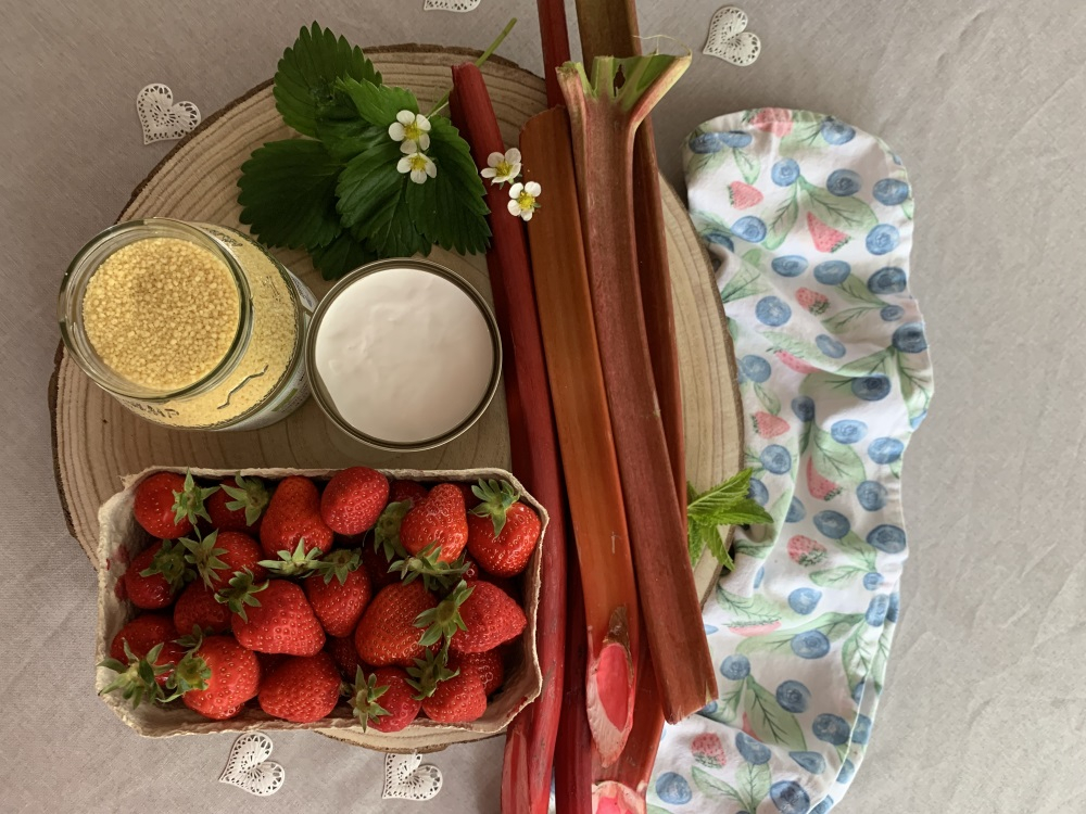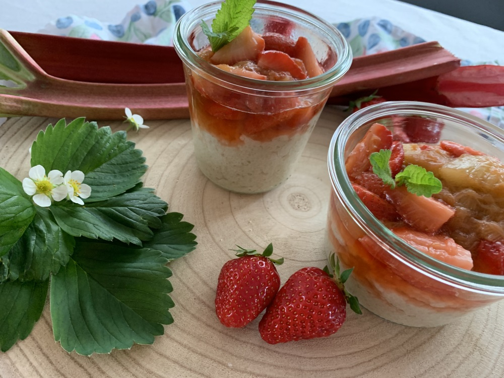 Rhabarber dünn schälen und in Stücke schneiden. Mit wenig Wasser und Agavendicksaft in einem Topf zum Kochen bringen und köcheln lassen, bis der Rhabarber leicht zerfällt. In der Zwischenzeit Erdbeeren waschen und vierteln. Die Erdbeeren in das heiße Kompott geben und zur Seite stellen. Die Kokosmilch mit dem Vanillezucker und der Prise Salz zum Kochen bringen. Couscous einrühren und kurz aufkochen und ca. 10 Minuten quellen lassen. Den kokos-Couscous in Gläser füllen, darüber das Kompott. Mit Minzblättchen garnieren. Warm oder kalt genießen.
