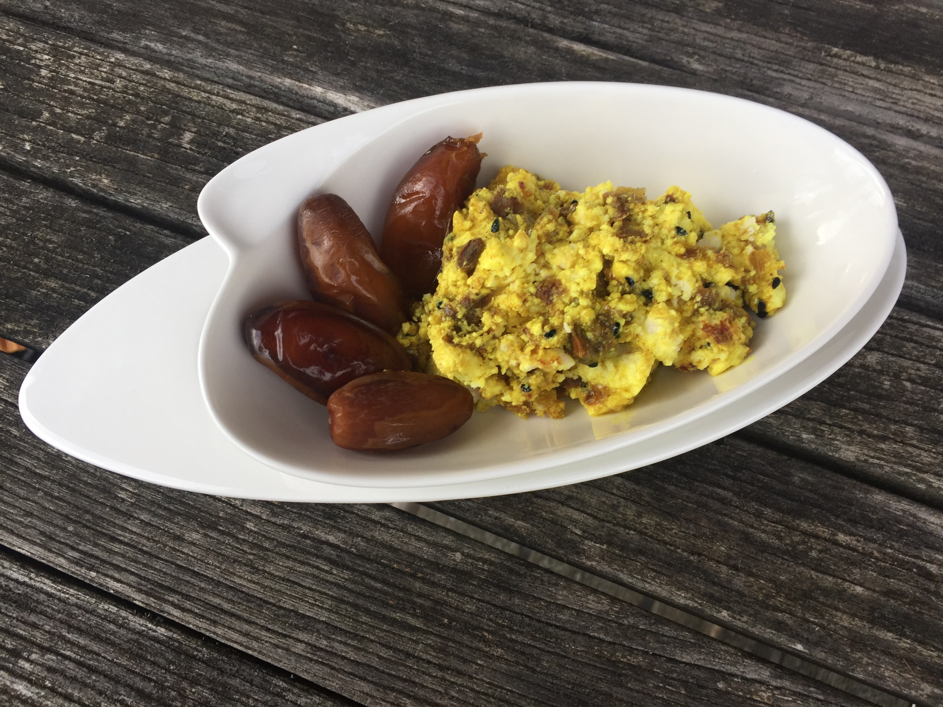 Die Datteln vom Stein lösen und klein schneiden. Knoblauch schälen und pressen. Den Frischkäse mit dem Sahnejoghurt mischen, Knoblauch und Gewürze unterrühren. Datteln dazugeben und bis zum Servieren kühl stellen.
