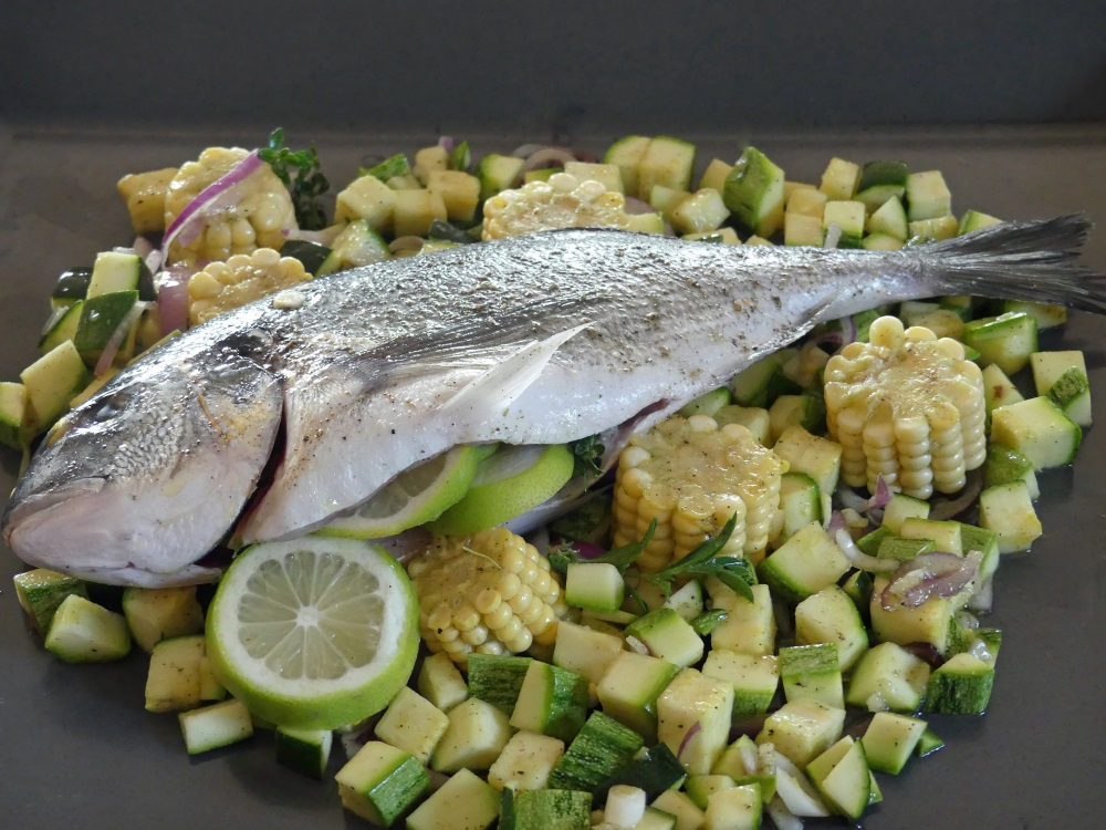 Gemüse-Kartoffel-Mischung gleichmäßig auf dem heißen Blech verteilen, Doraden darauf platzieren und im Ofen circa 25 Minuten garen.