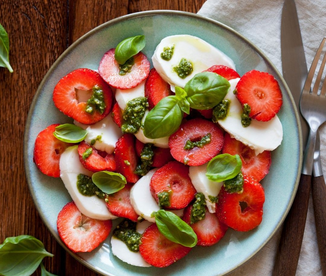 • Auf einem Teller abwechselnd die Erdbeerscheiben und Mozzarellascheiben anordnen.