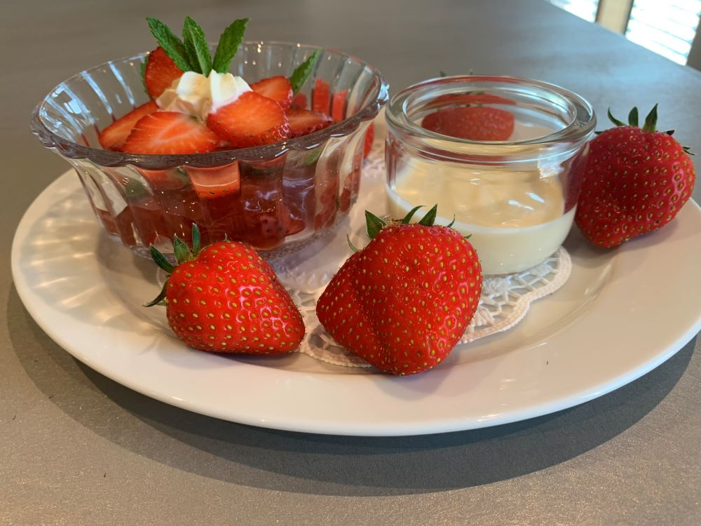 Inzwischen die Erdbeeren in kaltem Wasser waschen, Strunk entfernen und dann würfeln. In einer Schüssel mit dem übrigen Zucker (2 EL) und dem Zitronensaft mischen.