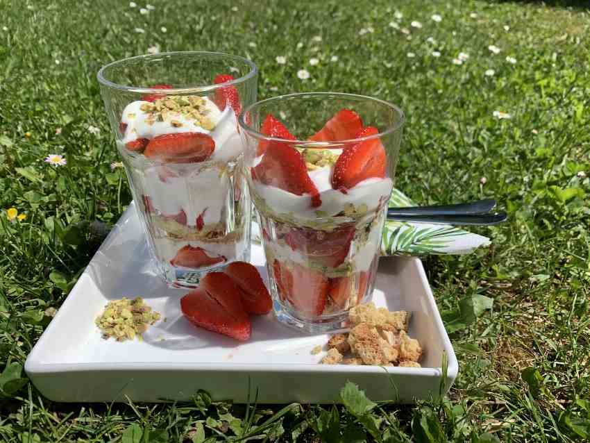 Von den Erdbeeren die grünen Kelchblätter entfernen und in Scheiben schneiden. Joghurt oder Sojade mit dem Vanillezucker verrühren. Die Kekse grob zermahlen oder in einen Beutel geben und mit z.B. dem Wellholz in kleine Stücke klopfen. Pistazien schälen und fein hacken. Das Avocadofleisch mit einer Gabel zerdrücken. Jetzt abwechselnd Erdbeeren, Joghurt, Keks, Avocado und Pistazien in Gläser schichten. Mit Joghurt abschließen und zur Dekoration Pistazien darüber streuen und evtl. ein paar Erdbeerscheiben.