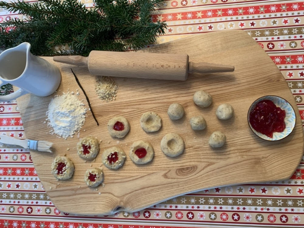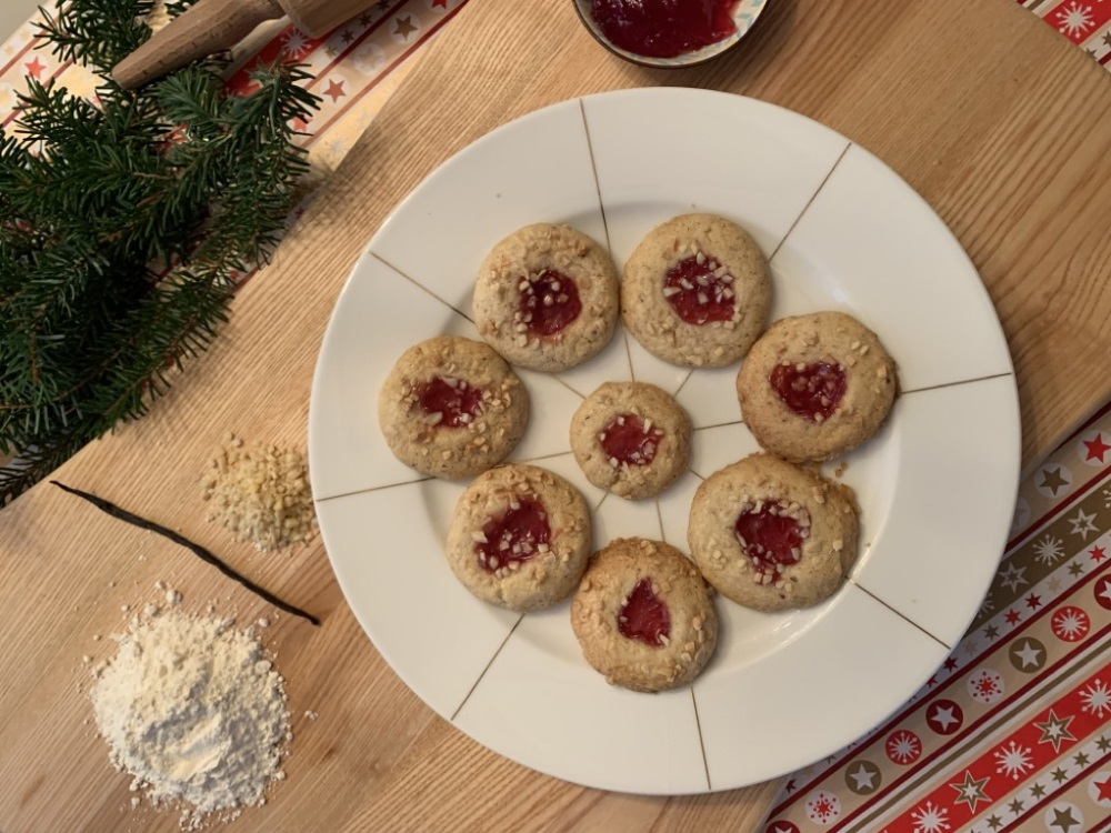 Alsan mit Mehl, Mandeln, Zucker und Vanillezucker zu einem glatten Teig verkneten. Mindestens 1 Stunde in den Kühlschrank stellen. Etwa gleichgroße Teigstücke mit Händen zu gleich Kugeln rollen. Kugeln etwas flach drücken und in die Mitte eine Mulde drücken – geht gut mit dem Stiel eines Kochlöffels. In die Mulde Lieblingsmarmelade oder Fruchtgelee füllen. Die Ränder mit Getreidedrink bepinseln und den Mandelstückchen bestreuen. Die Plätzchen bei 170°C im vorgeheizten Backofen goldbraun backen.