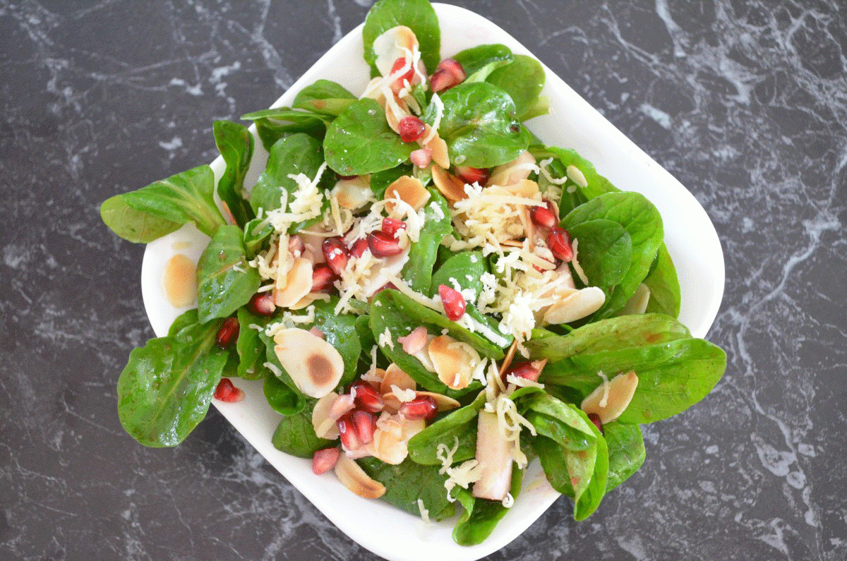 aus Essig, Öl, Granatapfelsaft und den Gewürzen eine Salatsauce zubereiten,