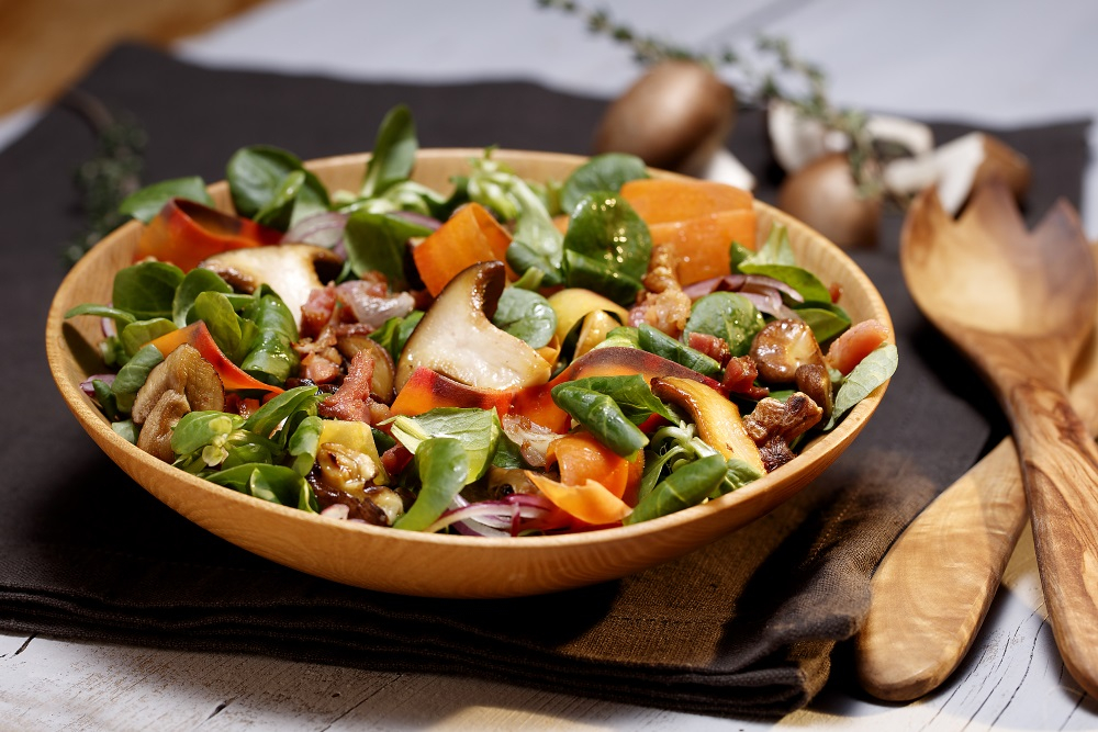 Den Feldsalat putzen und waschen. Die Zwiebel in feine Würfel schneiden. Aus den Zutaten für das Dressing die Salatsoße herstellen und die Zwiebeln dazu geben. Die Pilze säubern und die Möhren schälen und danach mit dem Schälmesser breite, dünne Streifen abziehen. Olivenöl in einer Pfanne erhitzen, Möhrenstreifen und Pilze zugeben und anbraten. Mit Kräutersalz und Pfeffer würzen. Den Feldsalat mit dem Dressing vermengen und das noch warme Gemüse mit dem Öl aus der Pfanne darüber geben.