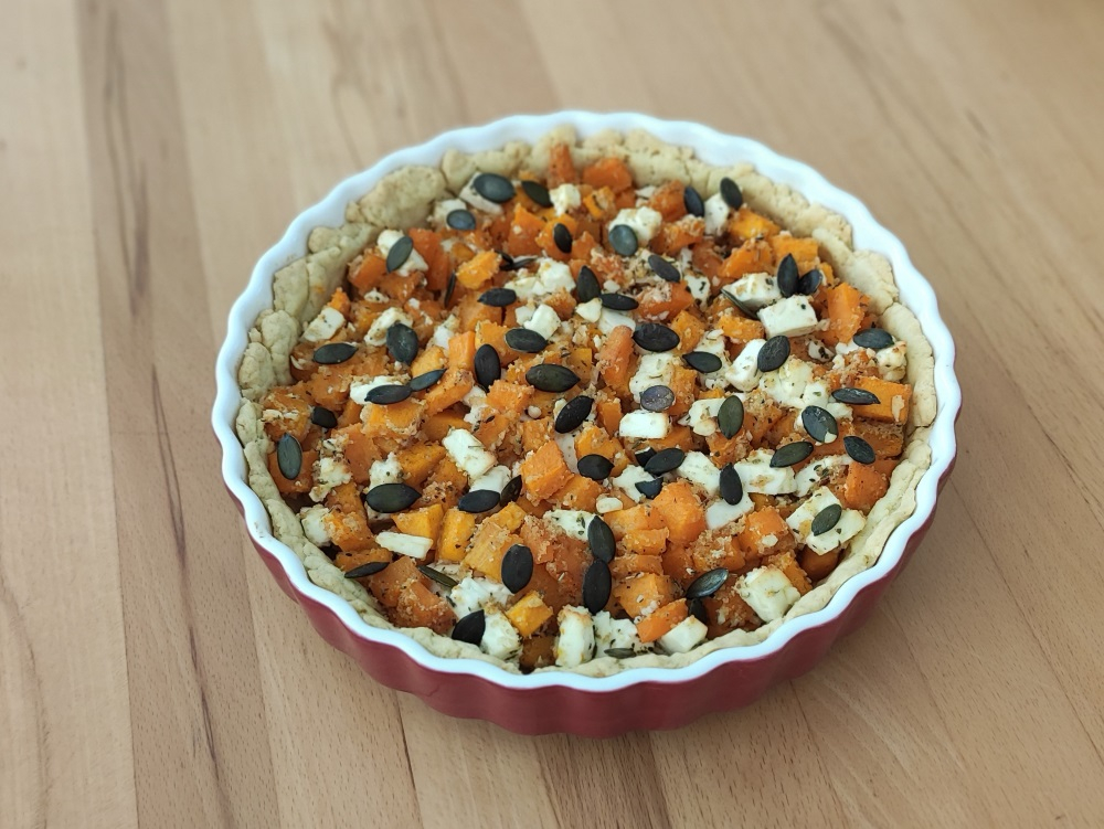 Die Tarte-Form einfetten, den Teig ausrollen und hineingeben, den Rand 2 cm hochziehen. Feta in kleine Stücke bröseln und mit Kürbisstücken und Paniermehl mischen. Ein paar Thymianblätter und die Kürbiskerne auf dem Belag verteilen.