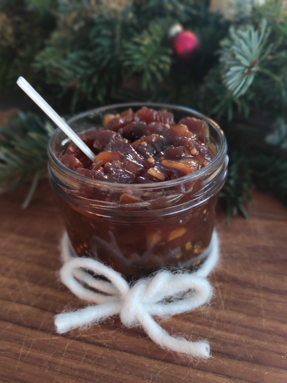 Apfel- und Aprikosenstücke mit Chili, Ingwer, Orangensaft und – abgeriebener Schale, Essig, Zucker, Lebkuchengewürz und Senfsaat in einem Topf mischen und einige Stunden ziehen lassen, ab und zu umrühren.
