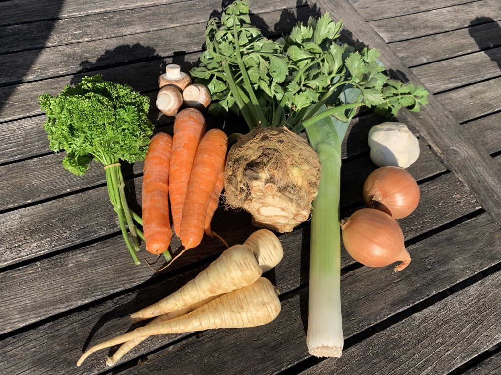 Gemüsebrühe: Zusätzlich zum Grundrezept benötigt ihr: 3 EL Olivenöl, Salz                                                                                                                       Das Gemüse putzen und zerkleinern. Beim Sellerie kann auch das Grün mit verwendet werden. Olivenöl in einer Pfanne erhitzen und das Gemüse (ohne Petersilie) darin bei starker Hitze anbraten. 1,5l Wasser angießen, Petersilie und Salz zugeben und bei kleiner Hitze mindestens 1h köcheln lassen. Schraubgläser mit kochendem Wasser ausspülen und die Gemüsebrühe über ein Sieb in die Gläser gießen. Heiß verschießen. Kühl gelagert lässt sich dieser Gemüsefond einige Monate aufbewahren. Wer möchte, kann die Flüssigkeit auch in Eiswürfelbehältern einfrieren. So kann dann bei Bedarf immer eine kleine Portion entnommen werden.                                                                                                                                                                                        Tipp: Aus Gemüseresten und Schalen lässt sich ebenfalls eine wunderbare Gemüsebrühe kochen.