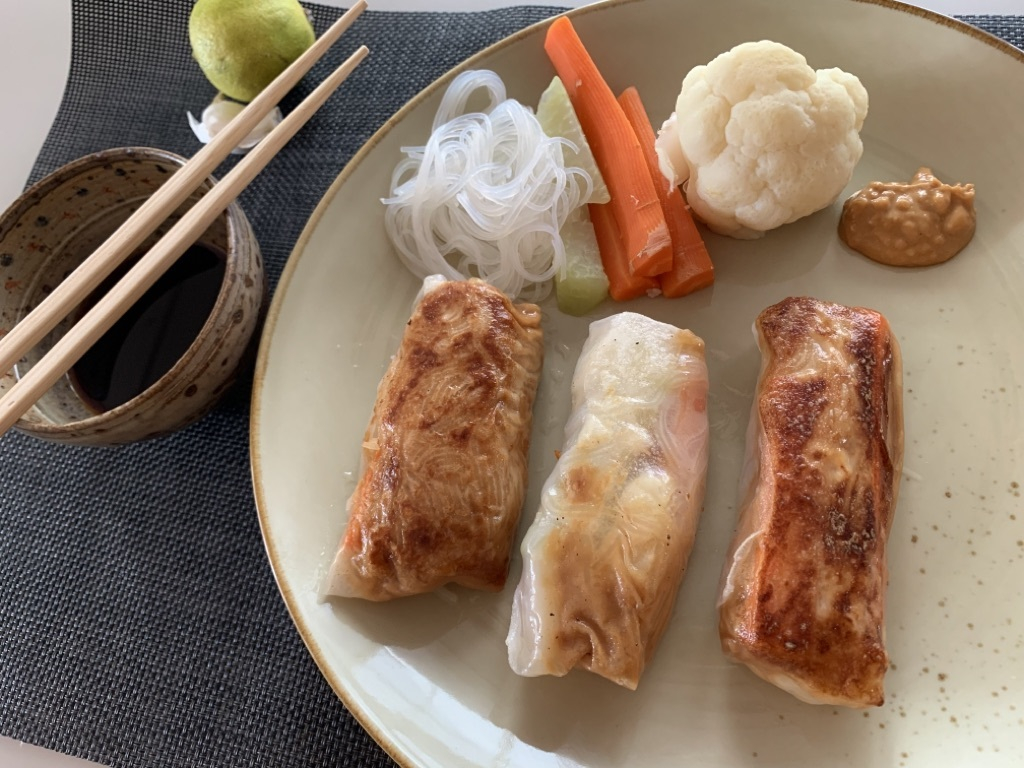 Das Gemüse in Sticks schneiden und kurz in kochendem Salzwasser bissfest garen. Glasnudeln mit heißem Wasser übergießen und ca. 10 Min. darin ziehen lassen und abgießen. Erdnusssoße aus: Gepresster Knoblauchzehe, Zitronensaft, Erdnussmus und Sojasoße mixen. Die Konsistenz sollte eher fester sein. Die Reispapierblätter kurz in kaltem Wasser einweichen, damit diese weich werden. Pfanne mit neutralem Öl auf mittlere Hitze bringen. Auf der unteren Hälfte des Reispapiers etwas von der Erdnusssoße streichen und Glasnudeln darauf geben. Gemüse ebenso darauf verteilen. Reispapier an den Seiten einklappen, von unten her einrollen und ein festes Päckchen packen. Die Gemüse-Päckchen dann in der Pfanne kurz von beiden Seiten anbraten. Sojasoße zum Dippen der Rollen bereitstellen.