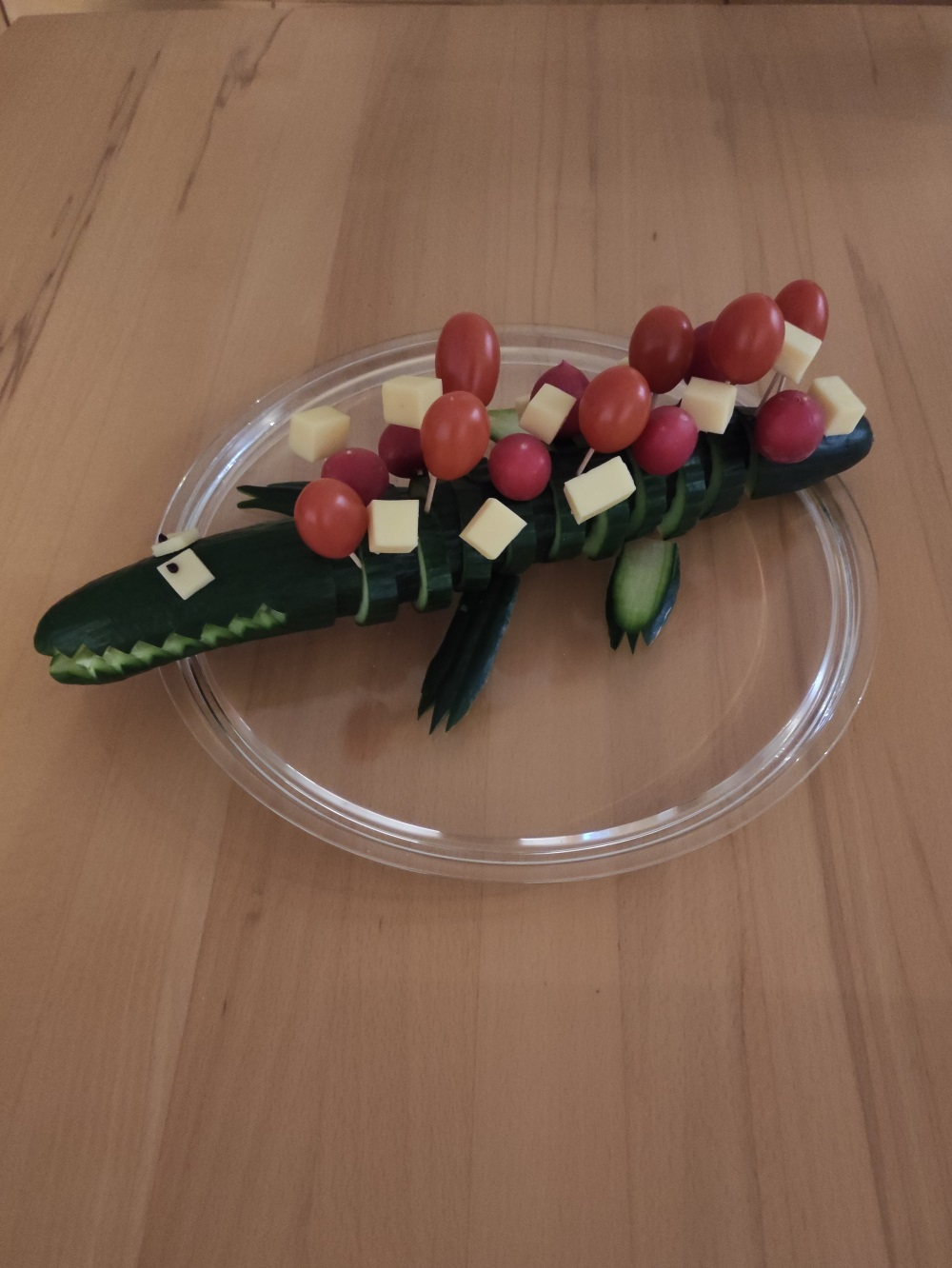 Das fertige Gurkenkrokodil legst du auf einen großen Teller oder ein Brettchen.