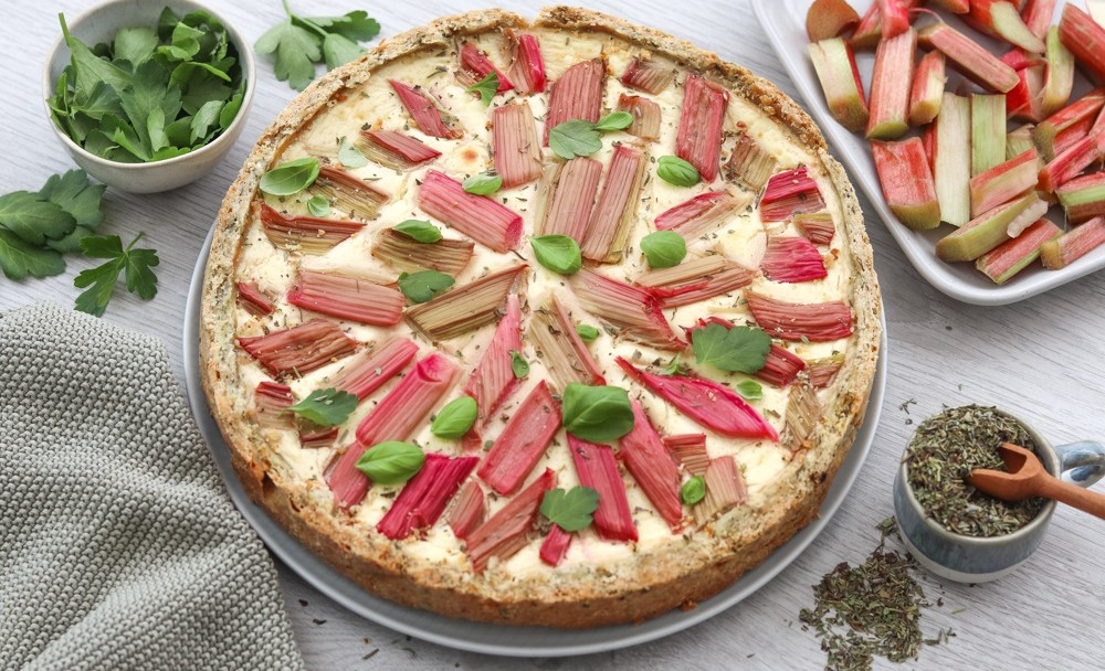 Den Kuchen aus dem Ofen nehmen und nach Belieben mit Rhabarber belegen. Weitere 10 Minuten auf der obersten Schiene backen. Auf einem Gitter 10 Minuten abkühlen lassen. Lauwarm mit frischem Basilikum bestreut servieren.