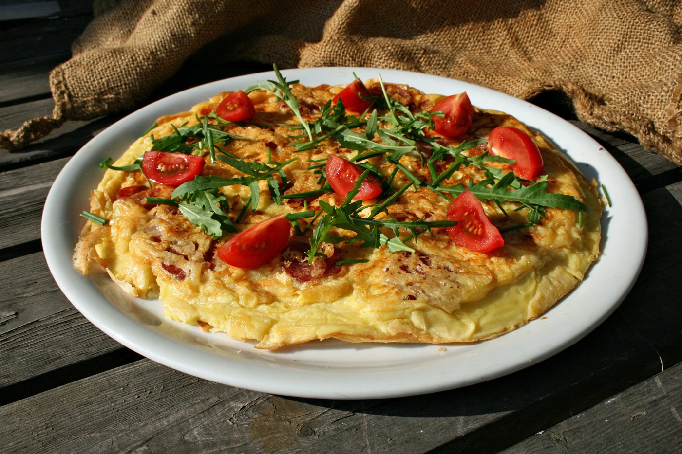 Wenn beide Eierkuchen jeweils auf einem Teller liegen, Rucola und Tomaten darauf verteilen und mit der Essig-Honigsauce servieren. Wenn du die Sauce separat reichst, kann sie jeder nach eigenem Geschmack über den Eierkuchen geben.
