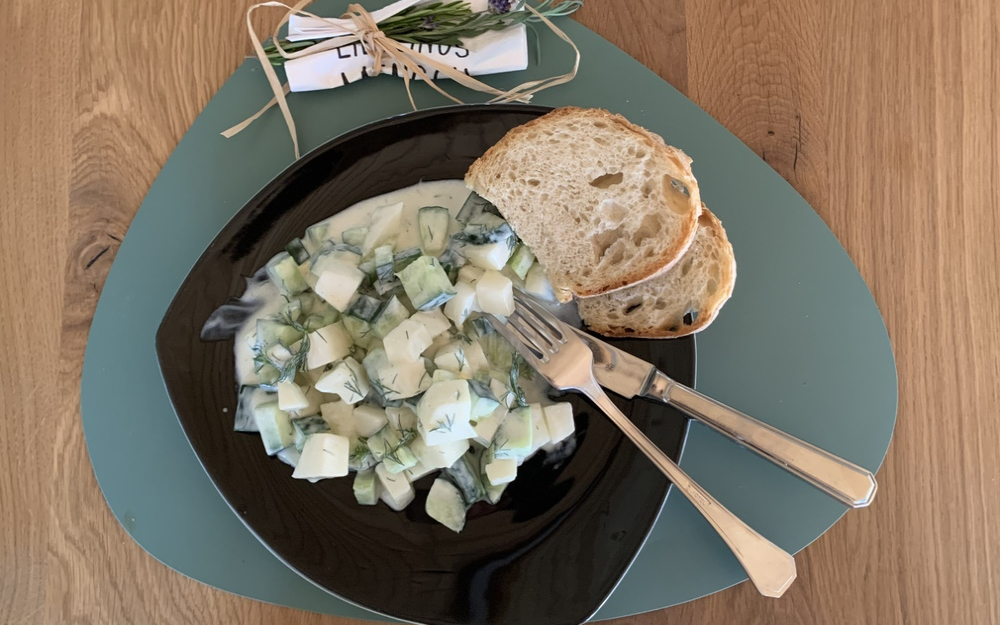 Die Melone halbieren, die Kerne entfernen und die Hälften in Scheiben schneiden. Das Fruchtfleisch von der Schale lösen und würfeln. Die Gurken waschen und ebenfalls in Würfel schneiden. Alle Zutaten mischen und das Ganze nochmals abschmecken.