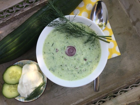 Gurken schälen und fein raspeln. Leicht salzen und am besten über Nacht das Wasser herausziehen lassen. Knoblauch und Zwiebel fein schneiden und mit dem Joghurt zu den Gurken geben. In der Küchenmaschine oder mit dem Mixer fein pürieren. Dill fein hacken und dazu geben. Mit Zitronensaft abrunden und Pfeffer abschmecken.