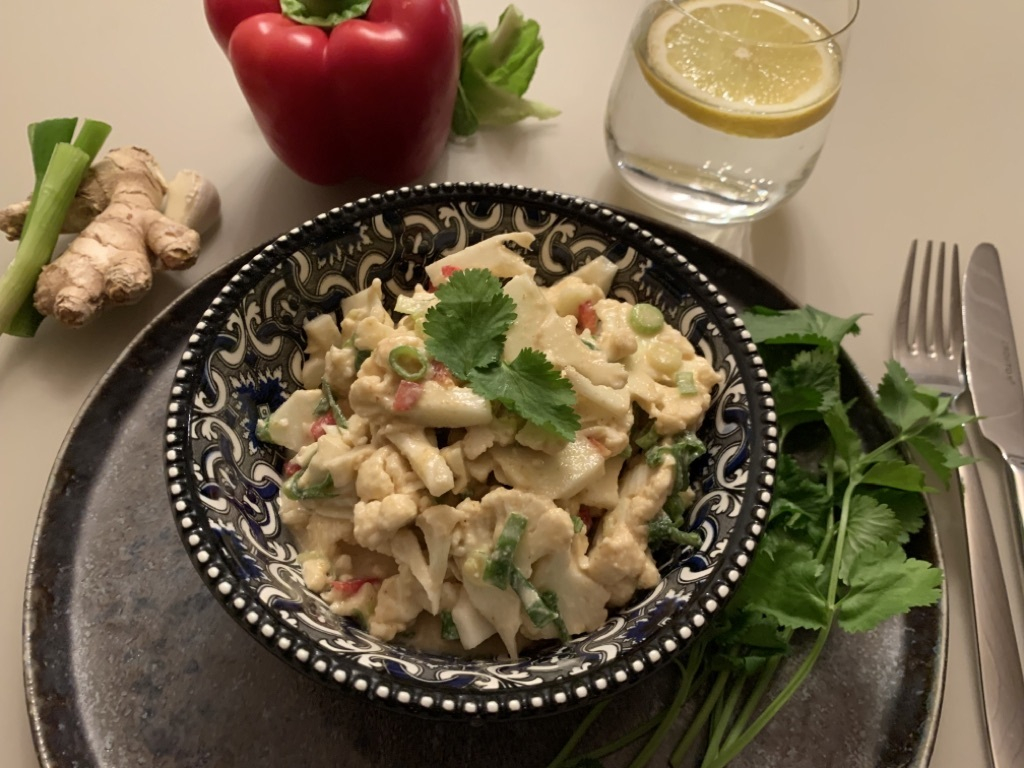 Den Blumenkohl waschen und in grobe Teile scheiden. Diese dann in etwa 0,5cm dicke Scheiben schneiden.  Paprika waschen und fein würfeln. Einige Stängel Bundzwiebeln ebenfalls waschen und in Ringe schneiden. Knoblauchzehe auspressen und ein kleines Stück Ingwer reiben. Kokosmilch mit 2 EL Erdnussmus und 1 EL Currypaste mischen – geht am besten mit einem Mixer. Knoblauch und Ingwer dazu geben. Das rohe Gemüse mit der Soße mischen und durchziehen lassen. Petersilie oder Koriander hacken und zum Salat geben.