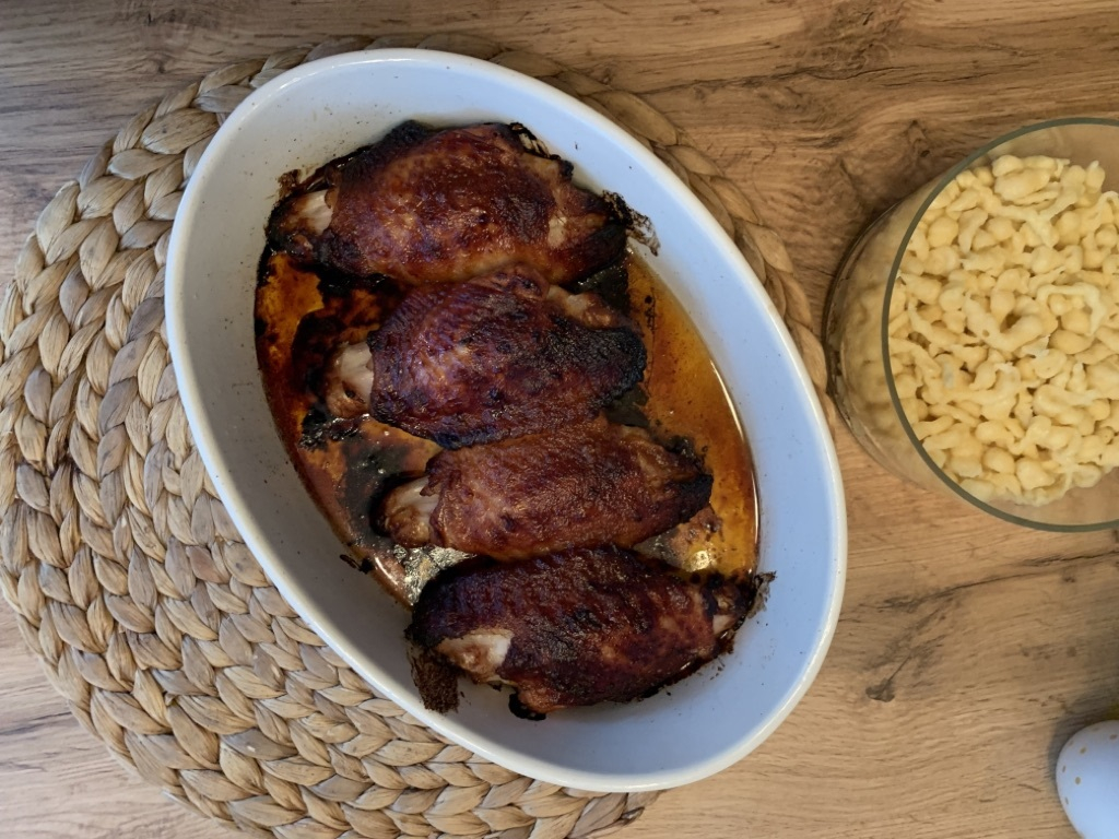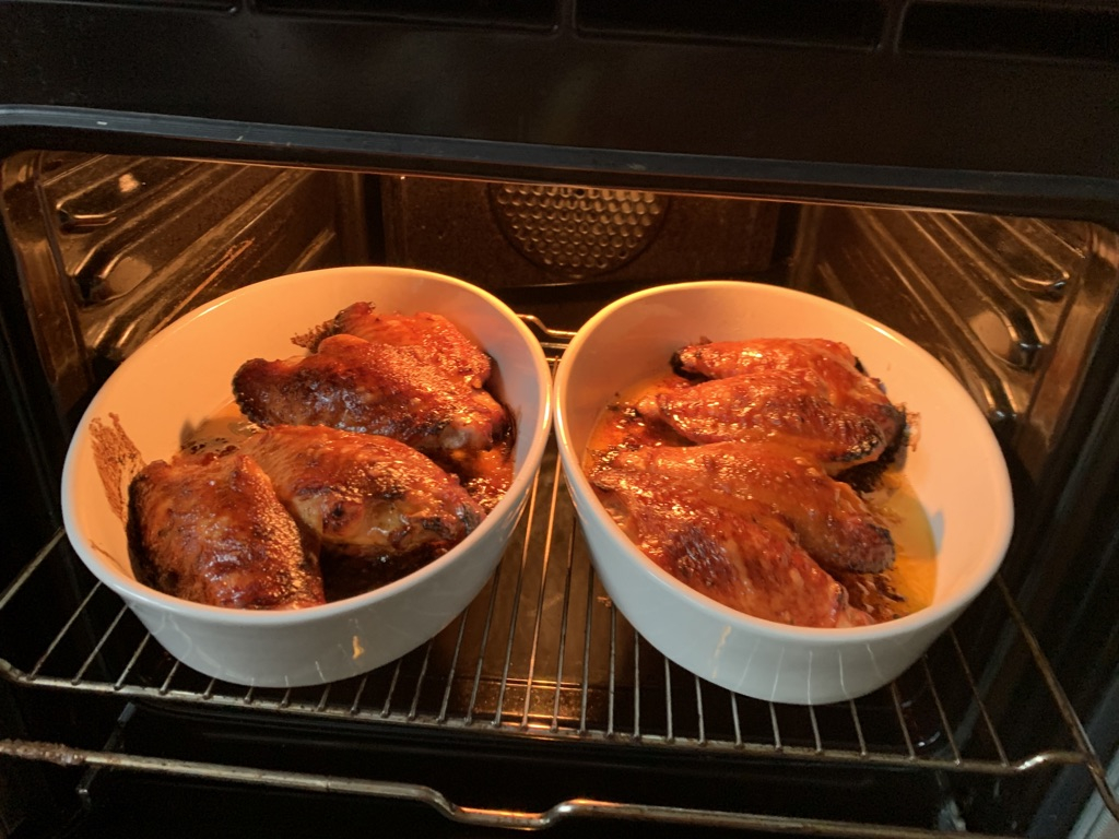 Die Putenflügel unter kaltem Wasser waschen und trocken tupfen. Aus den Zutaten eine Marinade herstellen und die Flügel damit einreiben. Die Flügel etwa 1 Stunde ziehen lassen. Restliche Marinade zur Seite stellen. Backofen auf 190°C vorheizen und die Flügel darin ca. 60 Minuten knusprig backen. Zwischendurch immer wieder mit der Marinade beträufeln und evtl.  wenden.