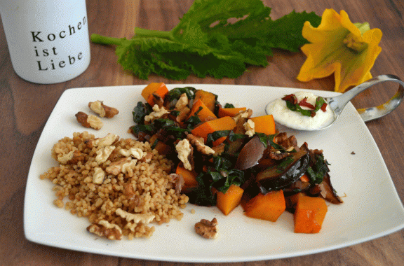 - Kürbis-Zwetschgen-Gemüse auf 4 Teller geben und mit Haselnüssen bestreuen,