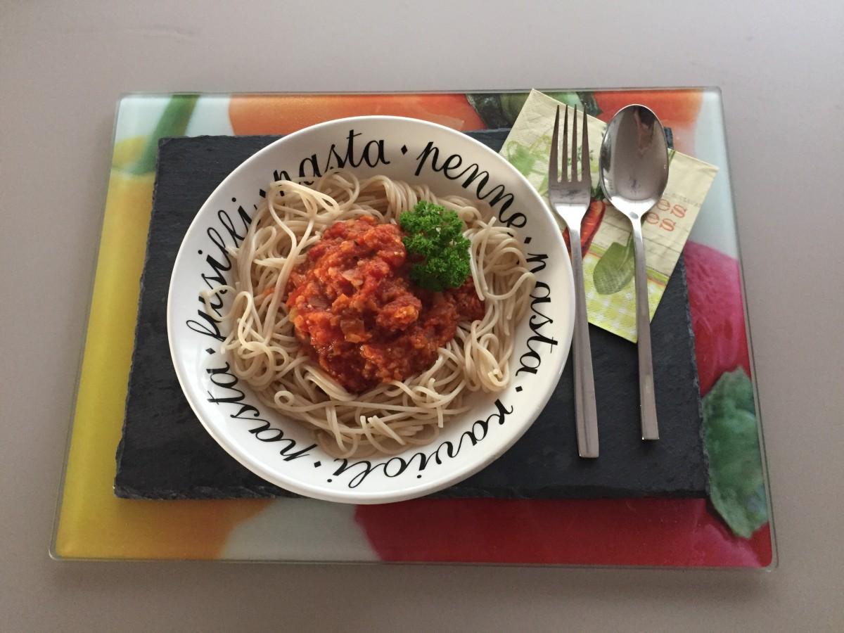 Linsen-Bolognese darauf verteilen und nach Wunsch mit Parmesankäse oder Chiliflocken bestreuen.