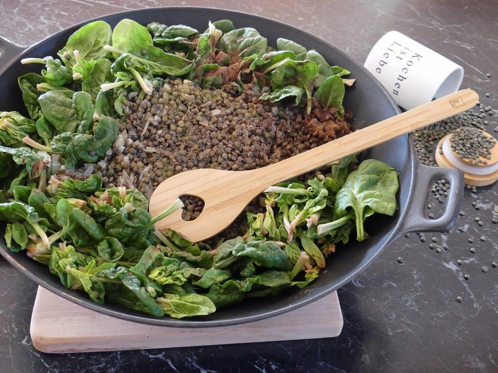 Inzwischen Spinat waschen, groß hacken und unter die Linsen rühren