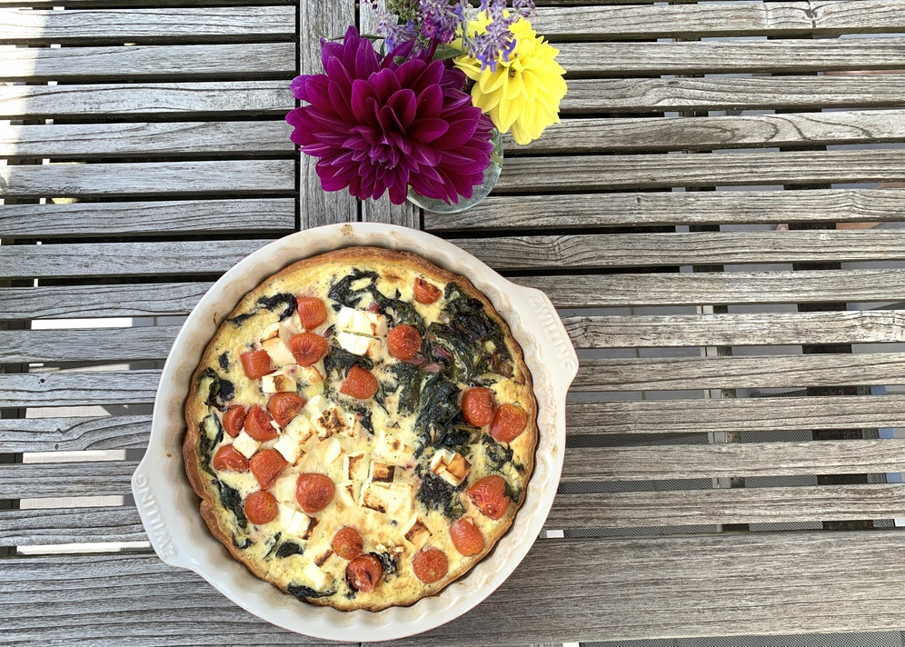Salz, Pfeffer und die geriebene Muskatnuss hinzugeben und nochmals umrühren. Den Backofen auf Umluft 180 Grad (Ober- und Unterhitze 200 Grad) vorheizen. Abgetropften Mangold, Feta und Tomaten auf dem Quicheboden verteilen. Danach dem Ei-Sahne-Mix darüber verteilen und die Quiche auf das Gitter im vorgeizten Backofen ca. 35 Minuten goldgelb backen. Nach dem Backen 10 Minuten abkühlen lassen.