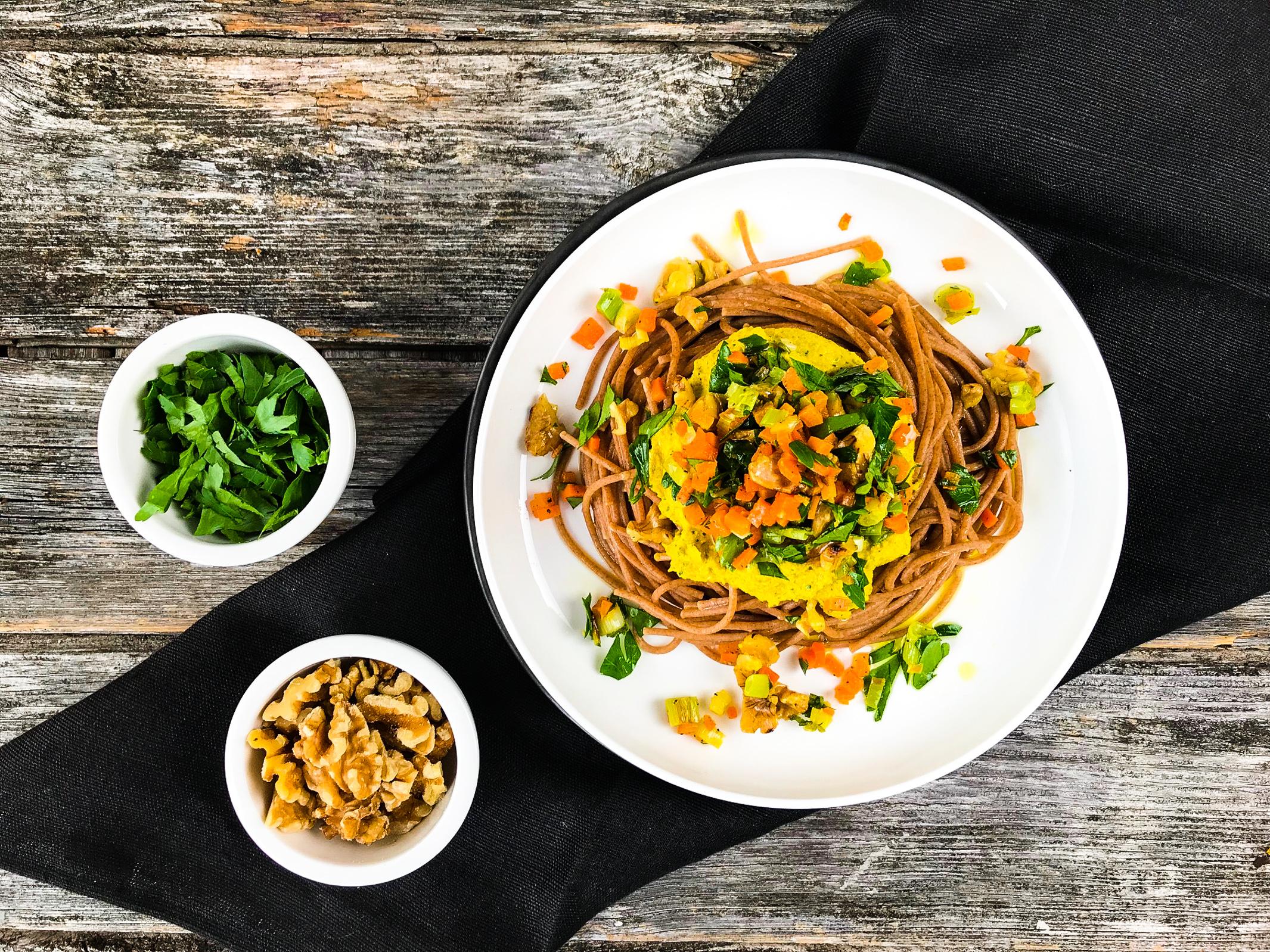 - das Röstgemüse über Nudeln und Pesto streuen und mit der zur Seite gelegten Petersilie garnieren.