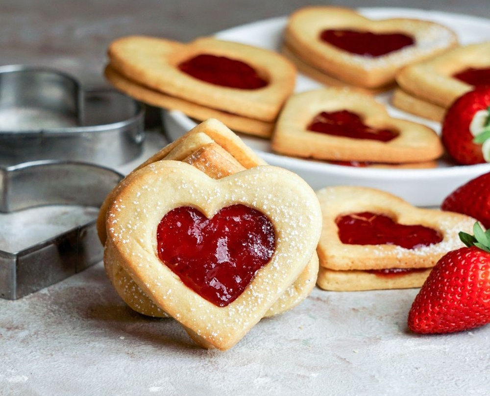 Erdbeermarmelade leicht erwärmen und auf die ganzen Herzen streichen. Die ausgestochenen Herzen daraufsetzen, leicht andrücken und mit Puderzucker bestäuben.