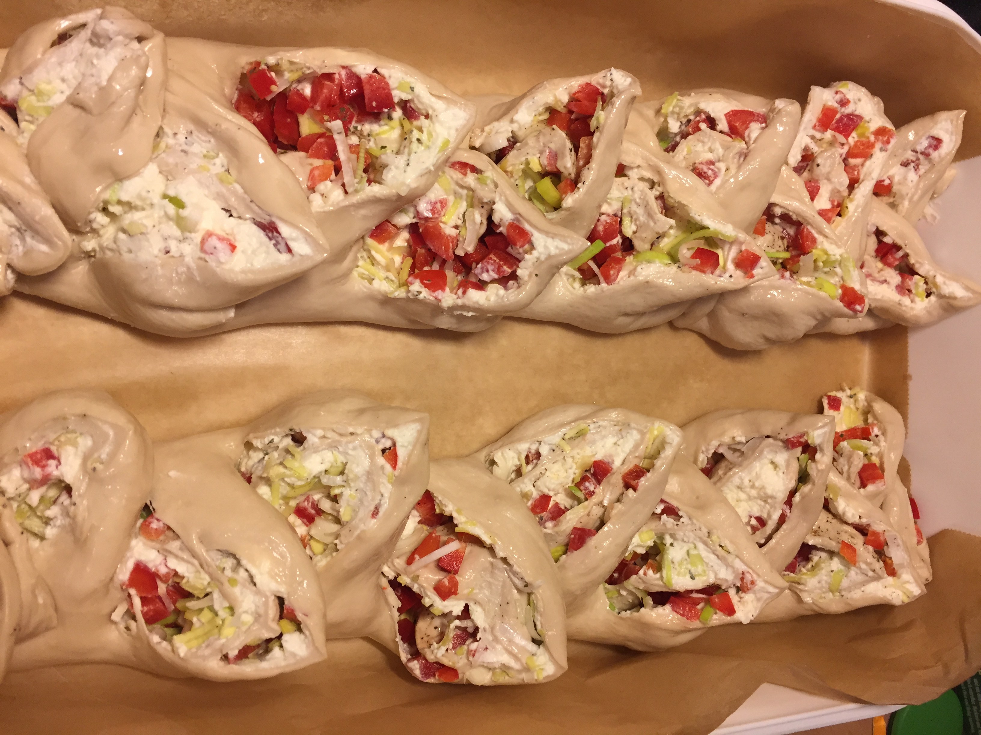 Für 2 Ähren: Lauch und Paprika waschen und sehr fein schneiden. Den Feta kleinbröseln und mit dem Frischkäse verrühren. Blätterteig oder alternativ Pizzateig ausrollen. Die Feta-Frischkäse-Masse gleichmäßig darauf verteilen. Das Gemüse darauf verteilen, mit Kräutern, Salz und Pfeffer würzen. Von der Längsseite her aufrollen. Mit einer Küchenschere schräg von oben in einem Abstand von ca. 4cm hälftig einschneiden. Dann immer abwechselnd links und rechts eine Ähre vorsichtig zur Seite schieben. Den Teig mit Olivenöl bestreichen. Im Backofen ca. 30 Minuten bei 180°C backen.