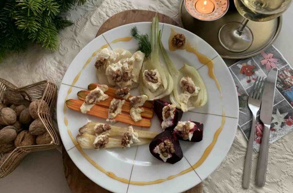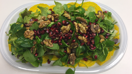 Die Gelbe Bete schälen, halbieren oder vierteln und in ganz dünne Scheiben schneiden. Auf einer Platte wie ein Carpaccio anrichten. Salate waschen, schneiden und in einem Sieb abtropfen lassen. Granatapfel in eine Schüssel mit Wasser geben. Darin aufschneiden und die Kerne auslösen (so bleibt alles sauber). Die Zutaten für das Dressing mit einem Schneebesen vermengen. Salate mittig auf der Platte anrichten, so dass seitlich die Gelbe Bete zu sehen ist. Dressing und Granatapfelkerne über dem Salat verteilen. Vor dem Servieren Walnussstücke in einer Pfanne ohne Öl kurz! anrösten und auf den Salat geben.