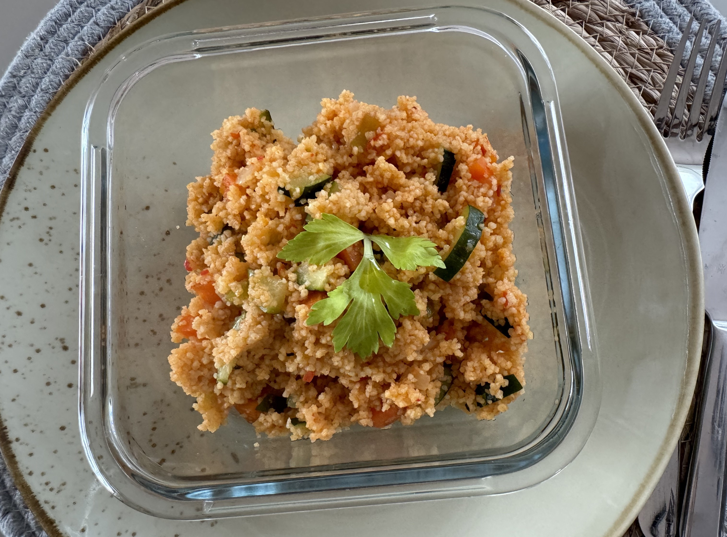 Gemüse schneiden und in der Pfanne mit Olivenöl anbraten. Couscous, Ajvar und Harissa zugeben und kurz mit anschwitzen. Mit ca. 300ml Wasser ablöschen und verrühren. Mit Salz und Pfeffer abschmecken und ca. 15 Minuten quellen lassen. Wer mag kann noch frische Kräuter und einige Spritzer frischen Zitronensaft dazu geben.