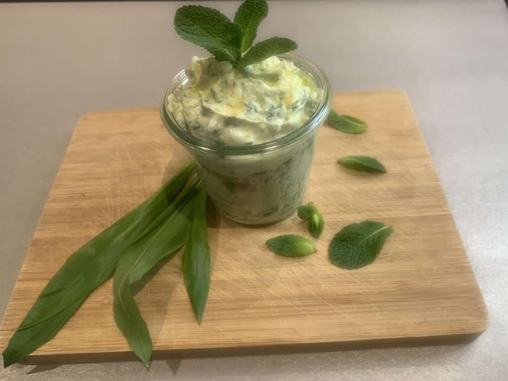 Die Crème fraîche in einen Zerkleinerer/Mixer geben. Den Bärlauch und die Minze auch in den Zerkleinerer einfüllen und alles zu einer geschmeidigen Creme mixen.