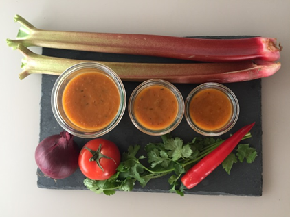 Rhabarber, Tomaten, Chilischote, Koriander, Essig und Zucker zufügen und aufkochen,