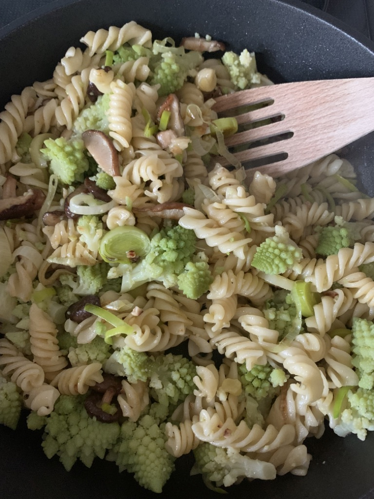 Romanesco in Salzwasser bissfest garen und abgießen. Die Röschen in kleine Stücke schneiden. Nudeln Al dente kochen (oder siehe Tipp). Lauch in Ringe schneiden, Pilze säubern und kleinschneiden und beides in einer Pfanne mit Olivenöl anbraten. Nudeln und Romanescostücke dazugeben. Mit etwas Sojasoße ablöschen, nicht mehr salzen. Evtl. ein bisschen frisch gemahlenen Pfeffer darüber geben.