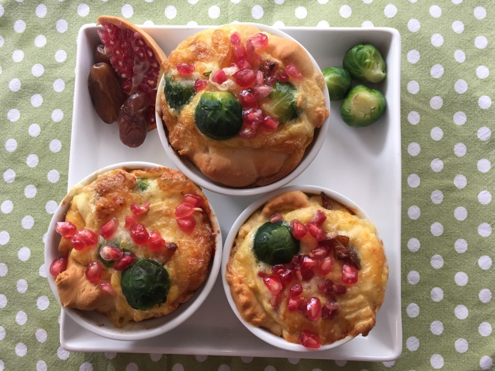Rosenkohl bissfest in Salzwasser kochen. Die Souffléförmchen mit Butter einpinseln und den fertigen Pizzateig dünn in die Förmchen auslegen. Mit der Gabel kleine Löcher in den Boden stechen und bei 175° ca. 5 Minuten vorbacken. In der Zwischenzeit 170g Weichkäse kleinschneiden und mit der Gabel zerdrücken, in eine Schüssel geben, Eier zugeben und verrühren. Masse mit Chilipulver würzen. Datteln kleinschneiden und dazugeben. Rosenkohl halbieren und auf den Pizzateig geben. Mit der Käse-Eier-Masse auffüllen und ca. 15 Min. bei 175° backen. Granatapfel entkernen und einige Kerne auf den fertigen Soufflés verteilen.