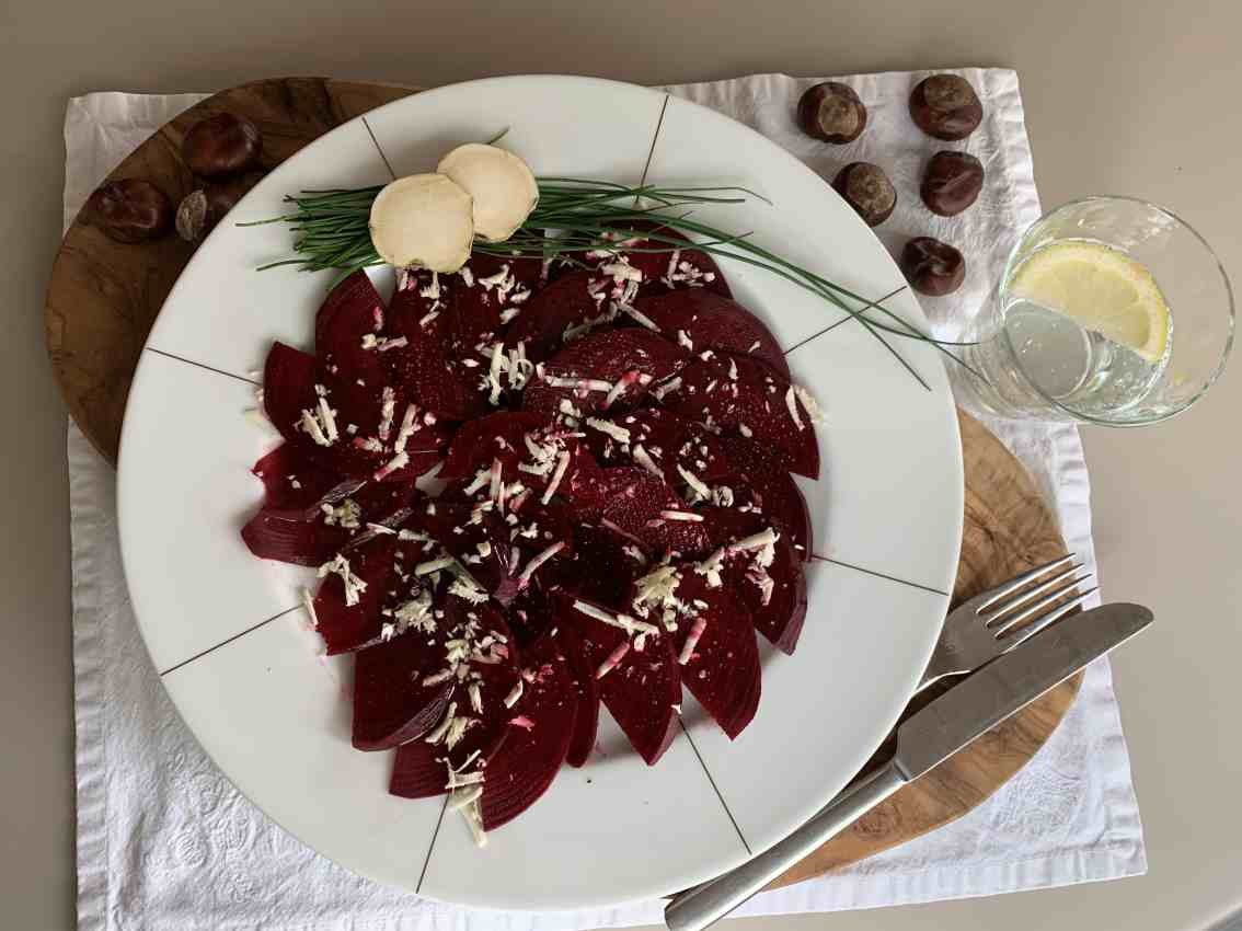 Rote Bete schälen, halbieren oder vierteln (je nach Größe) und in ganz feine Scheiben schneiden. Schön auf einem flachen Teller oder einer Platte anrichten. Gut salzen, gerne auch grobes Salz aus der Mühle verwenden. Zitronenhälfte auspressen und gleichmäßig über den Knollenscheiben verteilen. Meerrettich schälen, grob raspeln und über der Roten Bete verteilen. Zum Schluss mit Olivenöl beträufeln. Mindestens eine halbe Stunde durchziehen lassen, dann wird der Meerrettich etwas milder und dir Rote Bete nimmt den Geschmack der Gewürze an.
