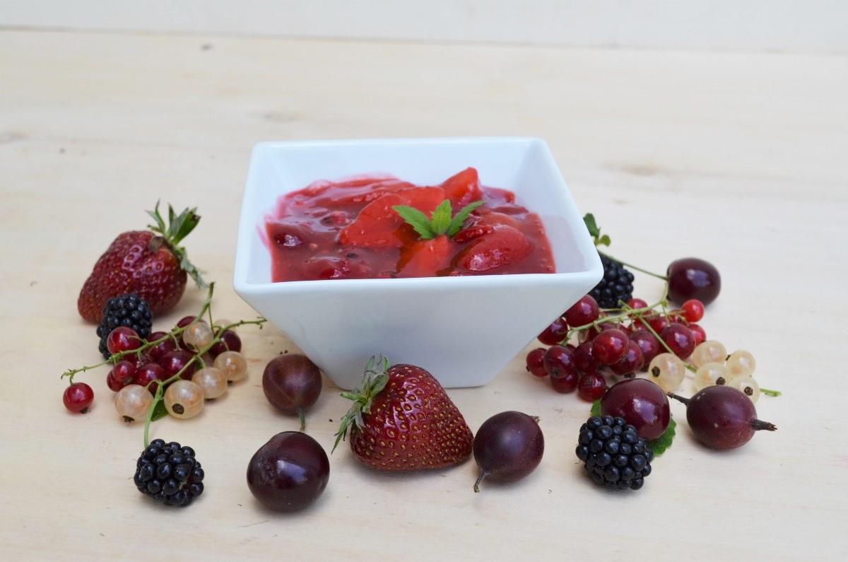 alle Beeren (bis auf Himbeeren) und die angerührte Speisestärke dazugeben und unter häufigem Rühren kurz aufkochen lassen,