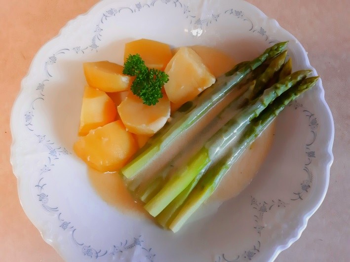 Die Eier trennen und das Eigelb in einen Topf geben. Bei mittlerer Hitze erwärmen. Speisestärke hinzu geben und mit dem Schneebesen verrühren. Mit der Gemüsebrühe nach und nach ablöschen. Dabei immer gut rühren. Den Riesling zugeben und die Zitrone für die Frische. Unter Rühren aufkochen lassen. Topf vom Herd nehmen und die Butter dazugeben. Solange rühren, bis die Sauce cremig und fest wird. Mit Salz und Pfeffer abschmecken.
