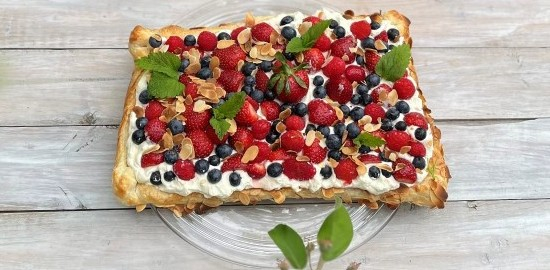 Die Quarkmasse locker auf dem Blätterteigboden verteilen. Die Früchte buntgemischt darauf streuen. Mit den gerösteten Mandelblättchen und einigen Minz- oder –Zitronenmelisse-Blättchen bestreuen und servieren.
