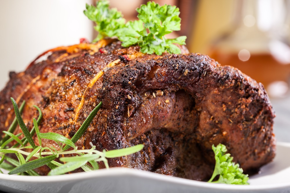 Fleisch mit Senf einreiben und der Hälfte der gehackten Kräuter bestreuen. Zwiebeln vierteln. Fleisch in eine feuerfeste Form legen, mit Butterflöckchen besetzen, Zwiebeln hinzufügen und im vorgeheizten Backofen bei ca. 175°C 1 1/4 Stunden schmoren. Nach und nach Flüssigkeit mit Fleischbrühe ersetzen. Braten herausnehmen, 10 Minuten warmgehalten ruhen lassen. Dann mit den restlichen Kräutern   bestreuen. Den Bratensud durch ein Sieb streichen.