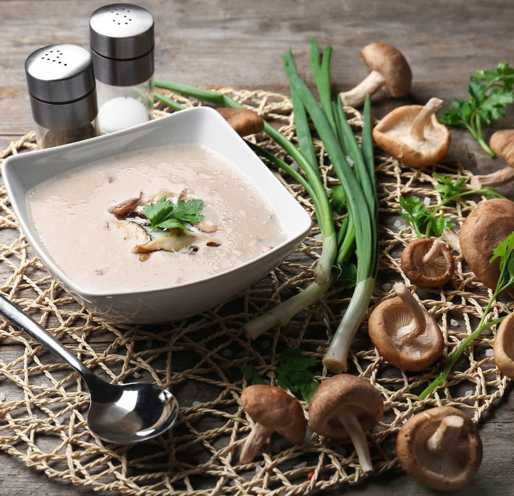 Butter in einem Topf erhitzen und die gehackte Zwiebel darin glasig anbraten. Shiitake-Pilze hinzufügen und 5 Minuten mitbraten.