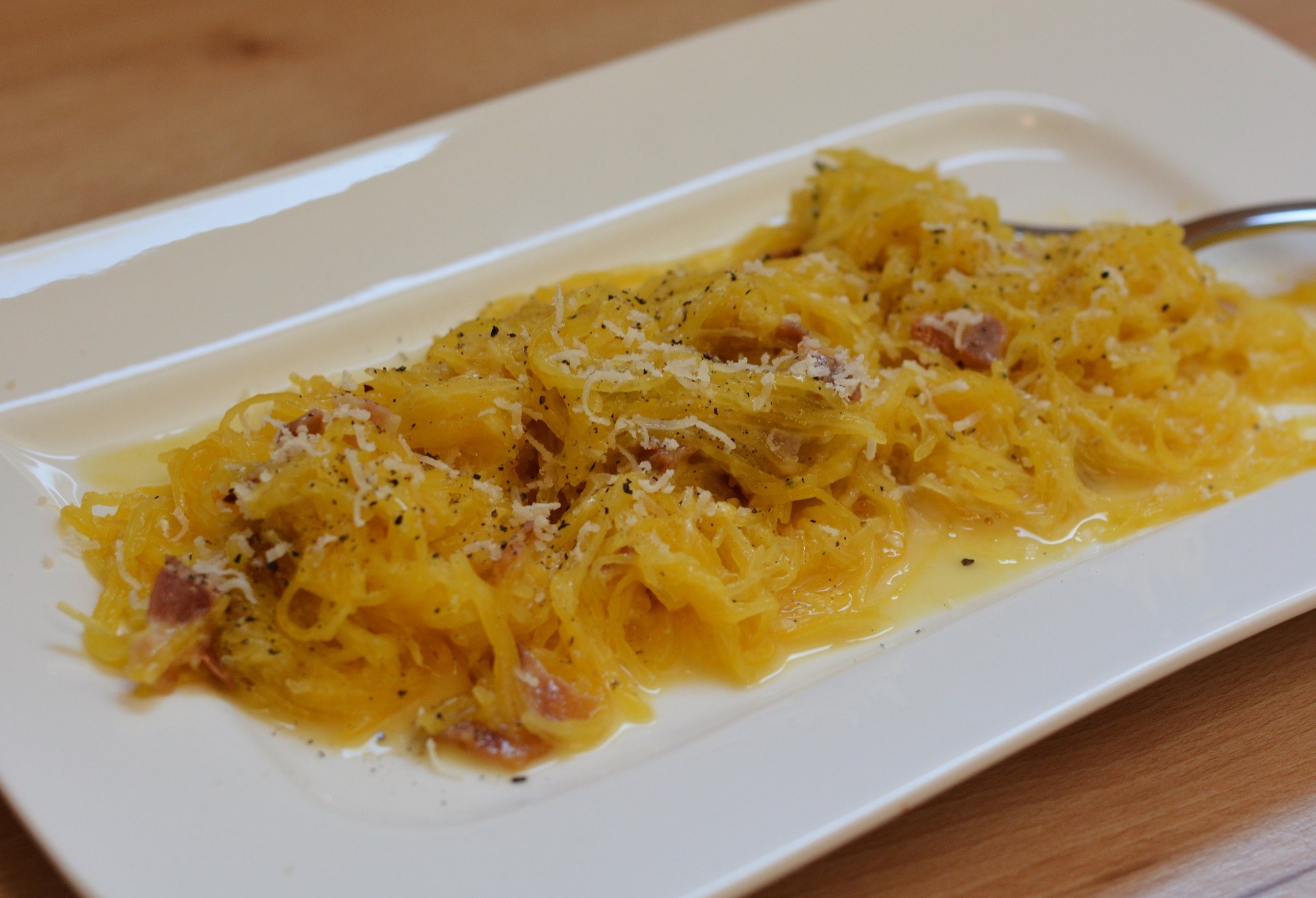 Spaghettikürbis quer halbieren, Kerne entfernen und im Dampfgarer oder in einem Topf mit reichlich Wasser kochen, bis er weich ist. Inzwischen das Ei aufschlagen und leicht salzen. Dann das Dörrfleisch quer in feine Streifen schneiden und in wenig Olivenöl knusprig anbraten. Wenn der Kürbis weich ist, lässt sich das Fruchtfleisch ganz leicht mit einer Gabel herauskratzen und verfällt zu Spaghetti"nudeln". Diese zum Dörrfleisch geben, Parmesan zufügen und alles zusammen kurz schwenken. Von der Herdplatte nehmen, das Ei zufügen, alles nochmals gut mischen, auf 4 Teller verteilen, mit frisch geriebenem Pfeffer bestreuen und sofort servieren.