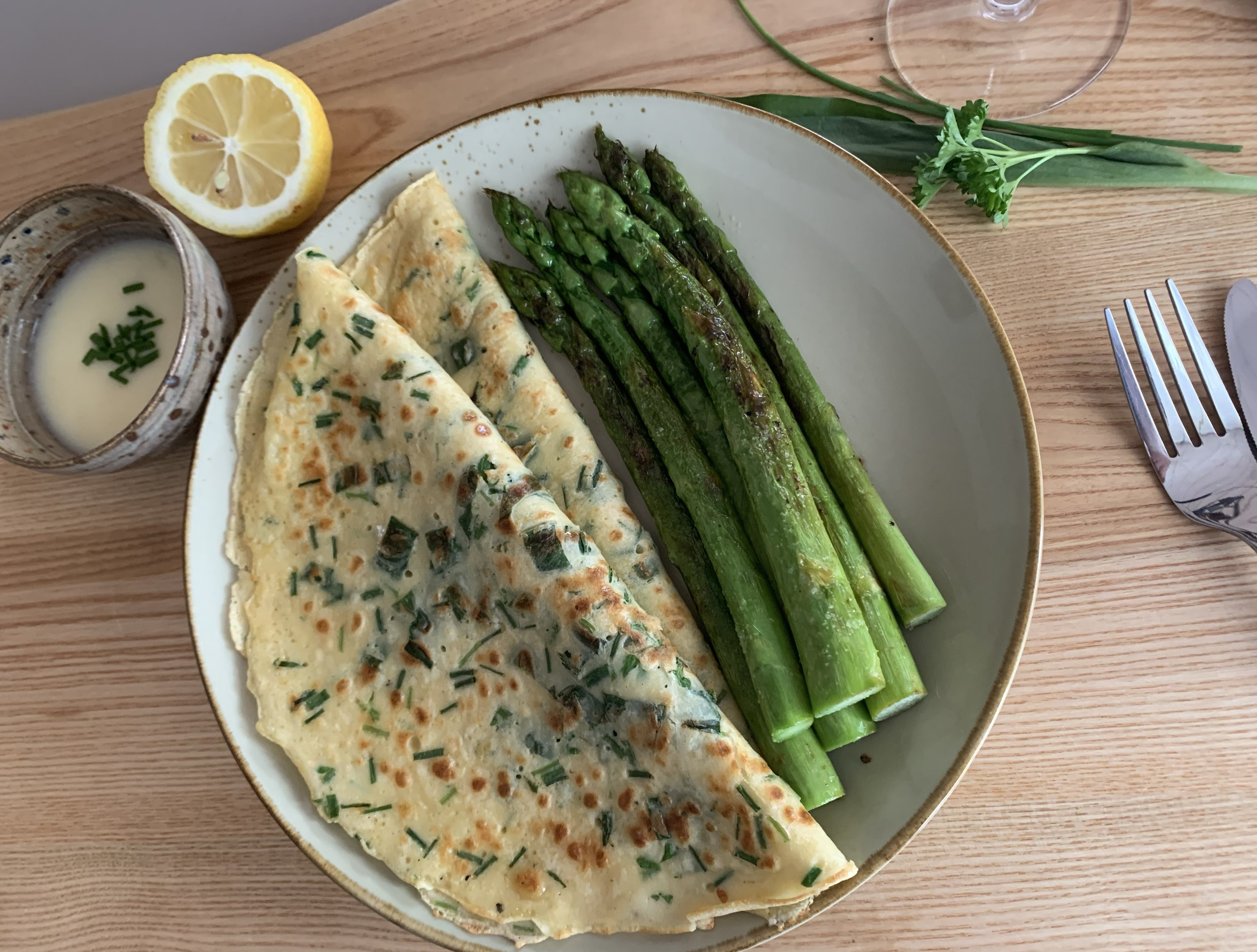 Die Kräuter fein hacken. Eier und Milch gut miteinander verrühren. Mehl einrühren und darauf achten, dass sich keine Klumpen bilden. Würzen und die Kräuter zugeben. In einer Pfanne dünne Pfannkuchen in Butter ausbacken. Die warmen Flädle gemeinsam mit dem Spargel servieren.